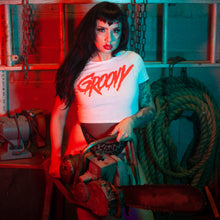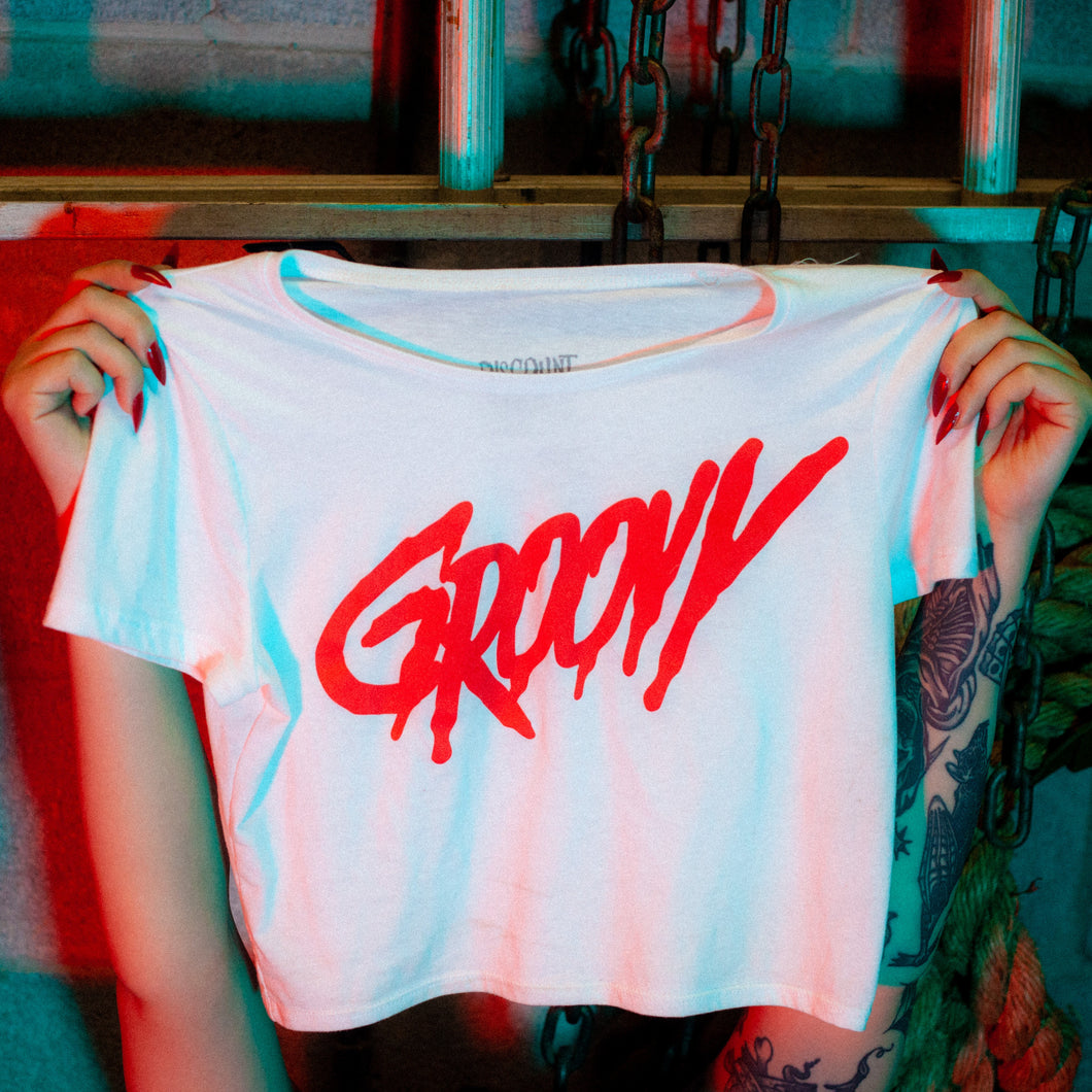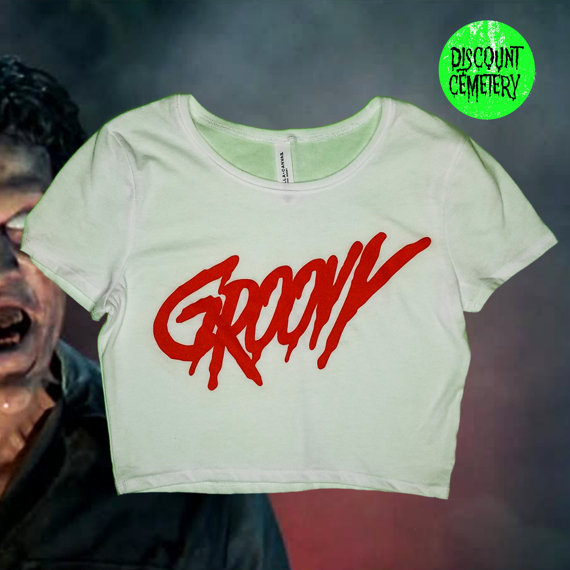 GROOVY. Our latest and greatest pays tribute to a very special sequel, released on it's 34th anniversary. We chose to print these on era-appropriate styles, like this white hi-crop top. As always printed with love here at the Cemetery.