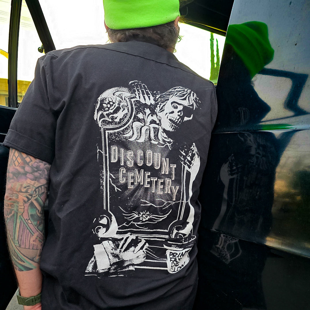 This blow mold perfectly encapsulates the sprit of Discount Cemetery. For this design, we pay tribute to look and feel of Halloween's past, with this plastic fantastic piece. Accompanied by a bucket of paint & squeegees, this is our favorite design yet.