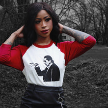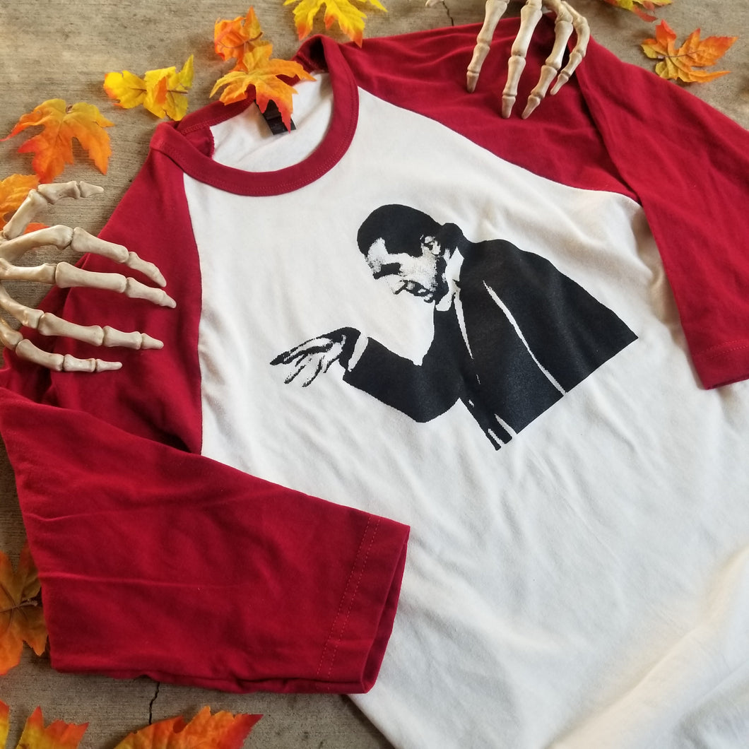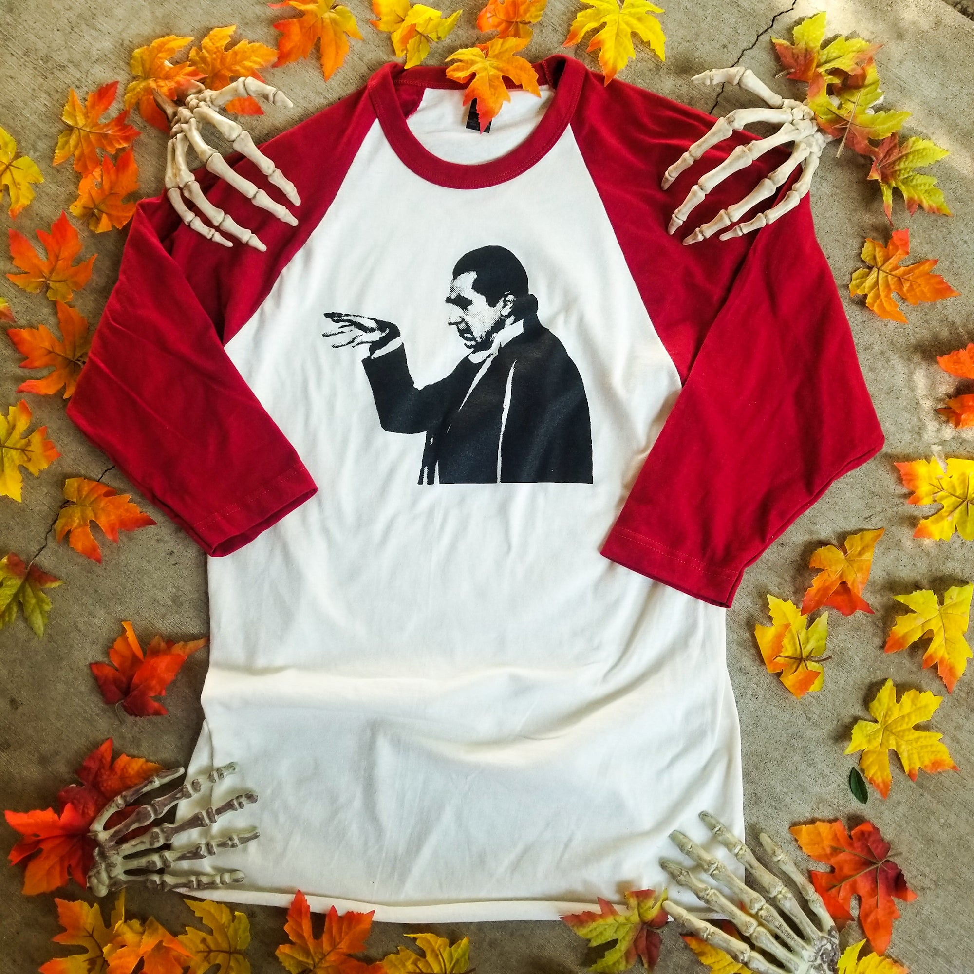 Cette chemise Bela Lugosi rend hommage à un design rare et presque disparu des années 1970. C’était la toute première chemise jamais fabriquée par Discount Cemetery, il y a de nombreuses lunes ! Bela est le meilleur, clair et simple. Ce raglan vintage blanc et rouge sang deviendra rapidement l'une de vos nouvelles chemises préférées.