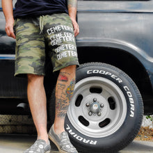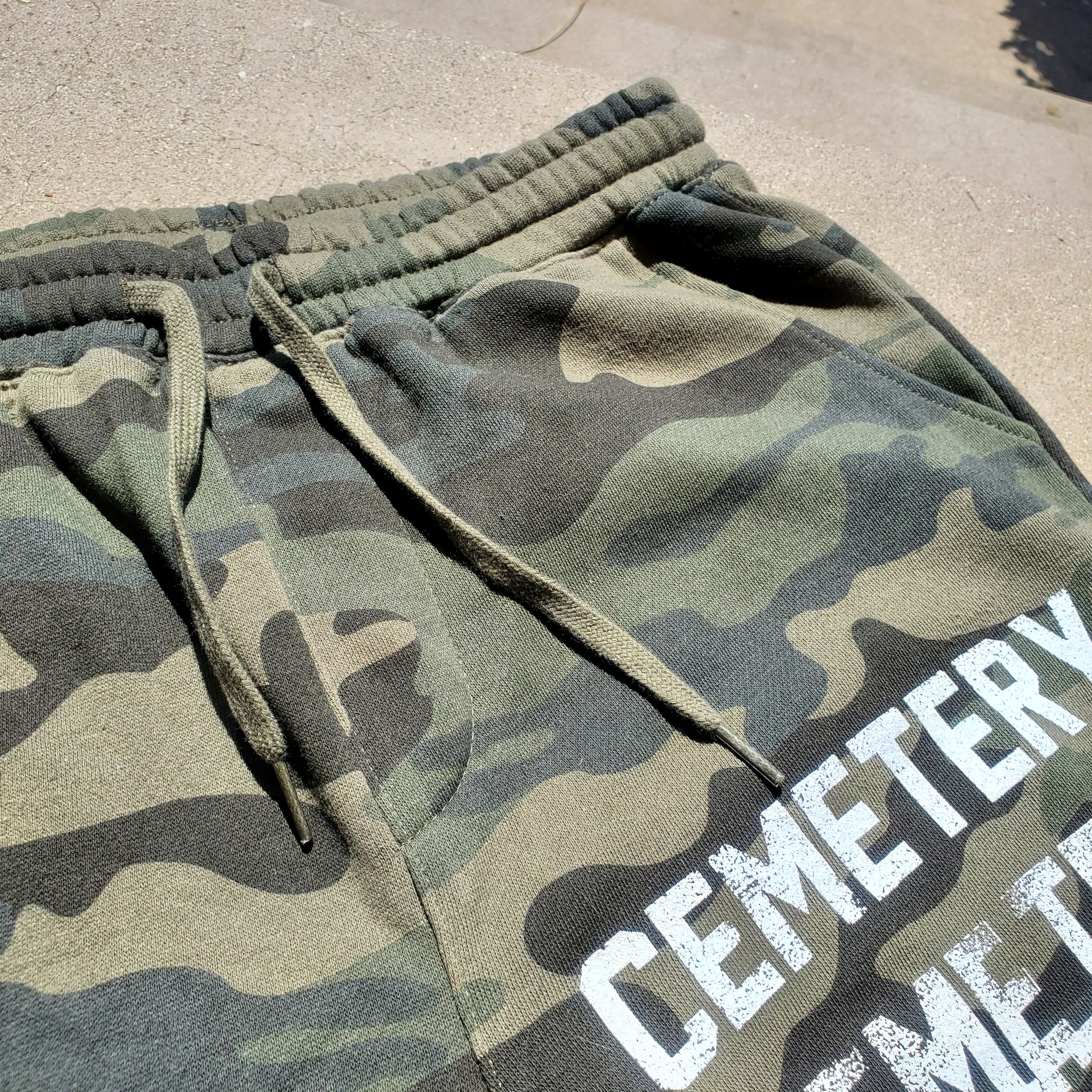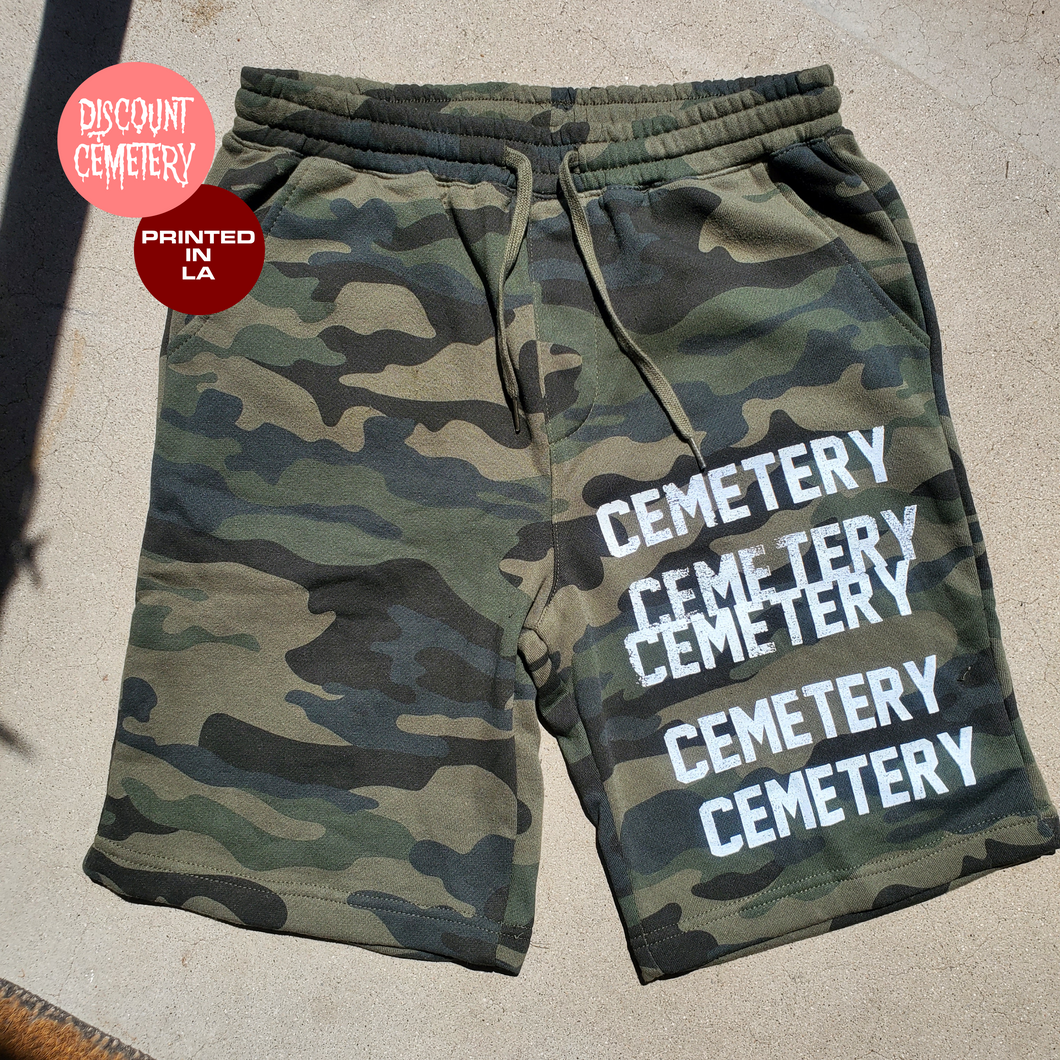 Short de poids moyen extrêmement confortable, doublé en polaire, sérigraphié à la main à Los Angeles. Ceinture avec cordon de serrage. Poches doublées en jersey, 2 devant et une derrière. Coupe décontractée et décontractée. Fonctionne fidèle à la taille. Encre blanche imprimée sur un short de couleur camouflage.